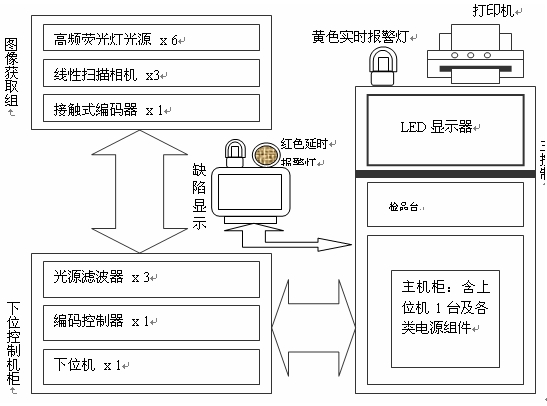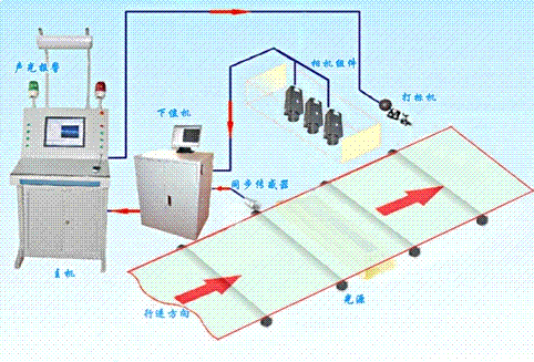 主機(jī)報(bào)警燈亮,報(bào)警音發(fā)出,顯示缺陷位置;收料工位的報(bào)警燈響亮,協(xié)助工人剔除廢料;貼標(biāo)機(jī)動(dòng)作,在次品張貼標(biāo);打印機(jī)打印統(tǒng)計(jì)信息。
