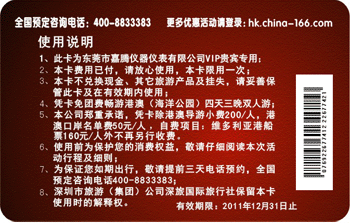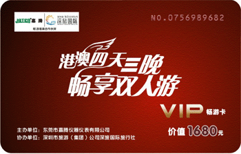 為答謝您一直以來對我嘉騰公司的關(guān)懷與厚愛,東莞市嘉騰儀器儀表有限公司與深圳市旅游(集團(tuán))公司深旅國際旅行社攜手推出“購嘉騰儀器,港澳雙人游”活動(dòng):自2010年10月1日起(有效期限2011年12月31日止),凡購買嘉騰公司指定產(chǎn)品(高端儀器或大型儀器)一臺以上,均可獲得我公司饋贈(zèng)的“港澳四天三晚雙人游--VIP暢游卡”一份!多買多送,送完即止!