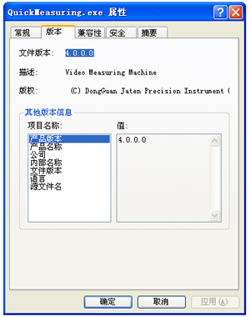 二次元影像測量儀、二次元檢測儀、二維影像儀QuickMeasuring測量軟件需要重新安裝時,因軟件重裝會將原有的數據覆蓋,導致之前設置或補償好的參數等數據無法復原,所以我們有必要在安裝系統(tǒng)或軟件前將數據文件重新備份,可在一次安裝軟件時直接使用,不用再做重復的數據參數設置工作。在備份數據之前請先確認QuickMeasuring測量軟件安裝目錄,默認路徑C:\Program Files\QuickMeasuring(S)下(對電腦桌面QuickMeasuring圖標鼠標右鍵->屬性->快捷方式->查找目標),打開軟件所在目錄,找到QuickMeasuring.exe文件,確認QuickMeasuring.exe文件版本(鼠標右鍵->屬性->版本),如圖:
